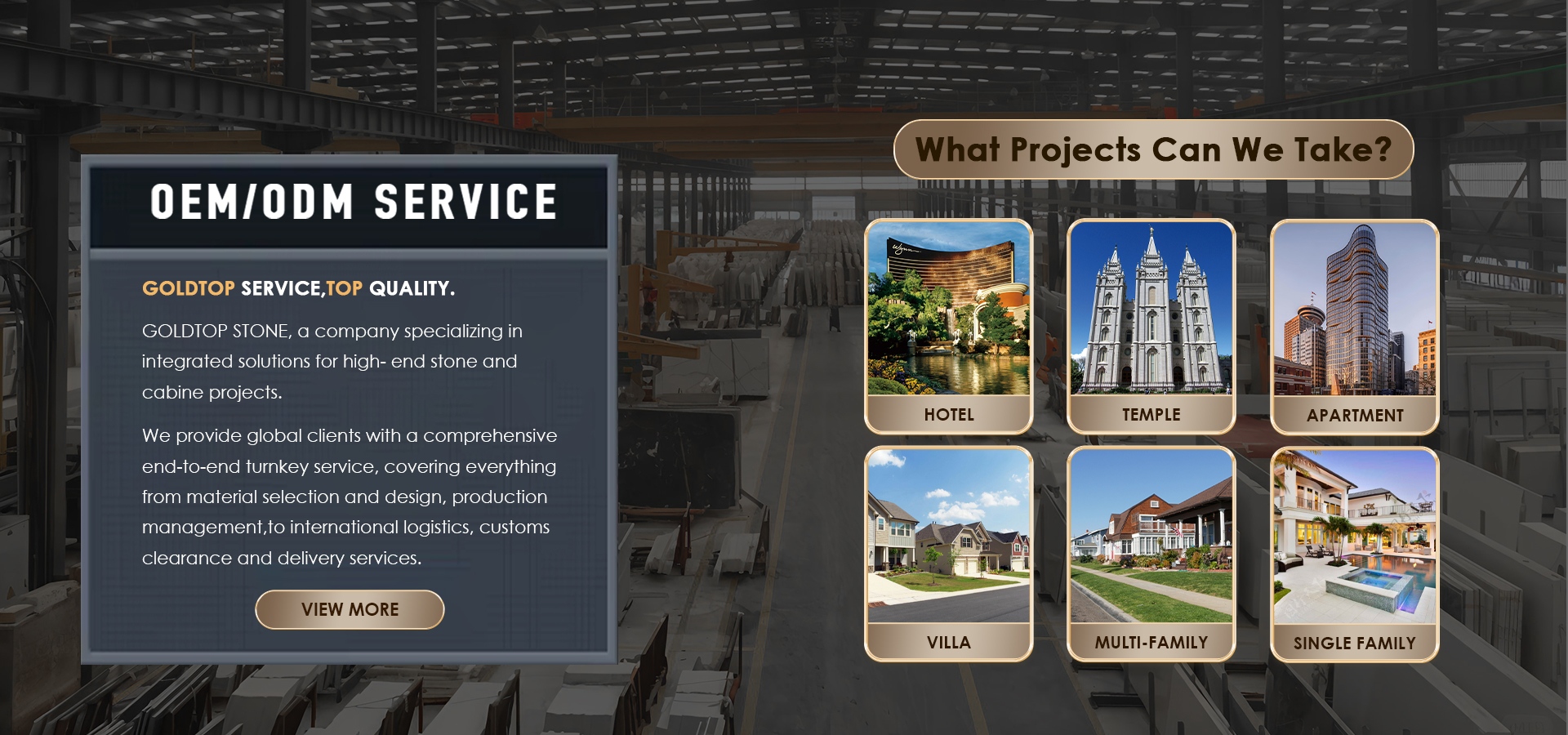 Goldtop предлагает широкий ассортимент облицовочного камня, тонкого кирпича, плитки и сборных железобетонных изделий. Архитектурный каменный шпон может быть использован для значительного улучшения внешнего вида проекта.