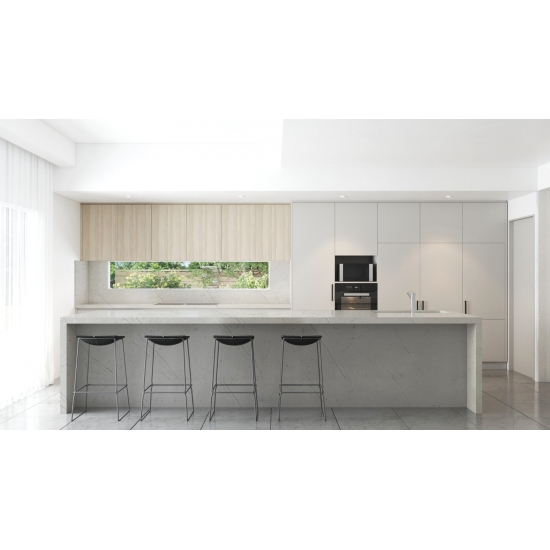 4005 Бьянка Вено Мраморная кварцевая плита Этот кварц отличается изысканной и элегантной эстетикой, характеризующейся мягким белым фоном, подчеркнутым тонкими, плавными серыми прожилками. Тонкие узоры, имитирующие мрамор, создают ощущение движения и естественной гармонии, придавая поверхности чистый, но роскошный вид. Этот кварц излучает вневременную утонченность, сочетая простоту и характер, и идеально подходит для украшения как современных, так и классических интерьеров, придавая им яркий, изящный и высококлассный вид.