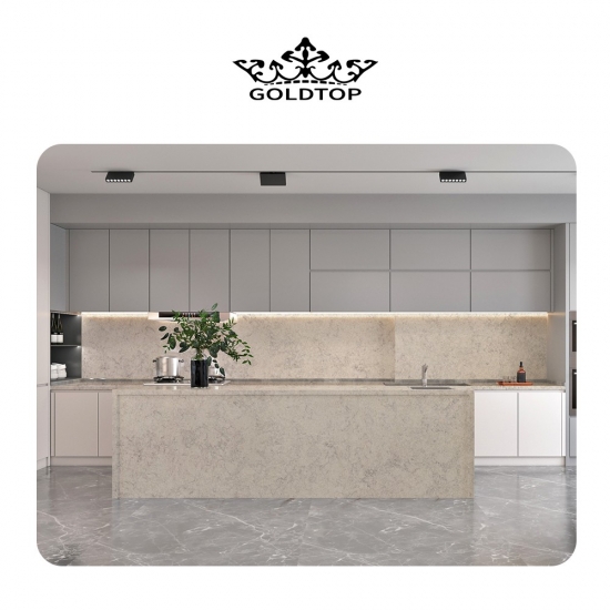 4011 Плита из кварцевого камня цвета «пустынный бежевый» Эта кварцевая плита отличается теплым и элегантным бежевым фоном, подчеркнутым мягкими, естественными прожилками, напоминающими мрамор. Тонкие вариации оттенков создают спокойную и изысканную поверхность, вызывая ощущение баланса и вневременной красоты. Ее нежная нейтральная палитра усиливает свет и пространство, делая ее очень универсальной как для классических, так и для современных интерьеров. Созданная для того, чтобы привнести тепло и изысканность, эта кварцевая плита добавит сдержанной роскоши любому помещению, в котором она используется.