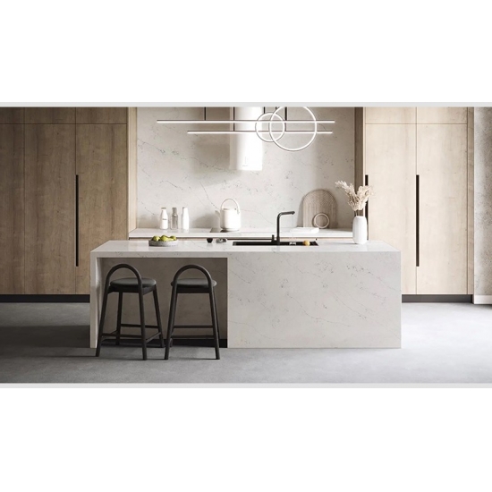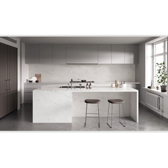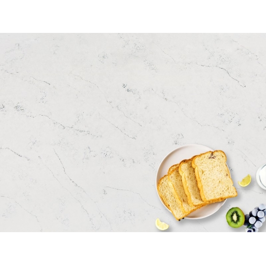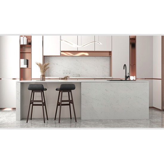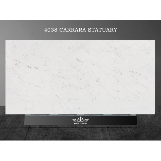 4038 Каррарский скульптурный мрамор, кварц Этот кварц отличается изысканным и элегантным внешним видом с мягким белым фоном, подчеркнутым изящными серыми прожилками, вдохновленными натуральным мрамором Statuary. Поверхность излучает вневременную утонченность, поскольку тонкие прожилки естественно перетекают по плите, создавая ощущение движения и глубины. Этот кварц призван привнести светлую, роскошную атмосферу в любое пространство, что делает его идеальным выбором для кухонь, ванных комнат и элитных жилых или коммерческих интерьеров.