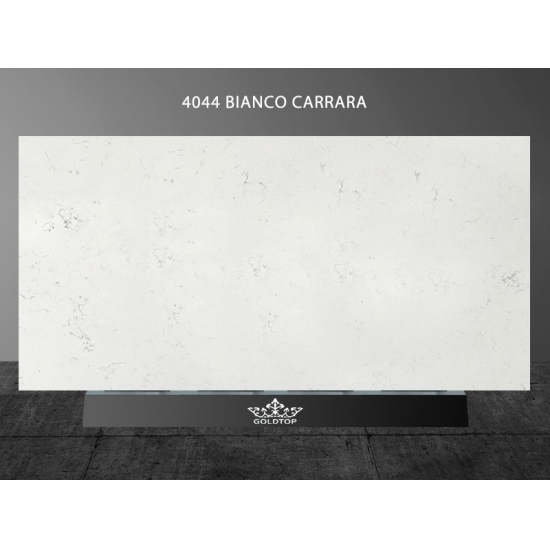 4044 Кварцевая плита из белого каррарского мрамора Этот кварц отличается чистым и вневременным внешним видом благодаря мягкому белому фону, подчеркнутому изящными, плавными серыми прожилками. Поверхность излучает сдержанную элегантность, а тонкие узоры, имитирующие мрамор, создают утонченный и гармоничный вид, добавляя глубину, не перегружая пространство. Этот кварц призван создать классическую эстетику, привнося ощущение яркости, баланса и изысканности как в жилые, так и в коммерческие интерьеры.