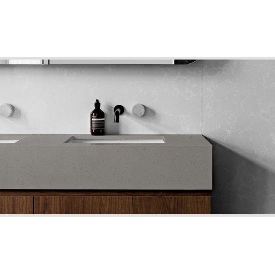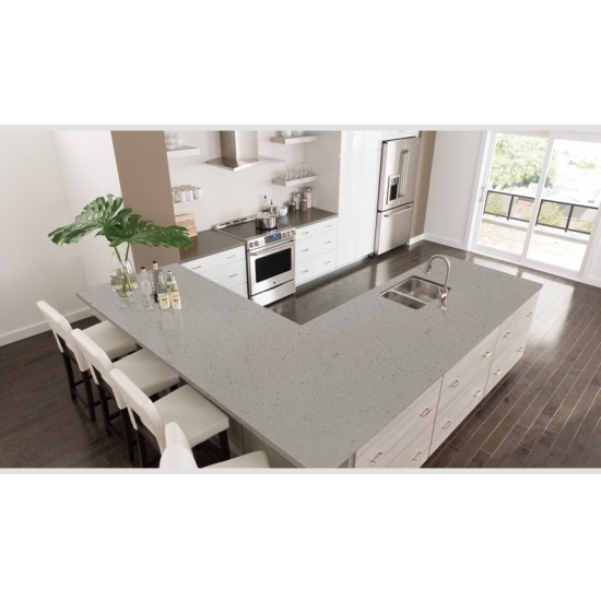 4046 Кварц из серого мрамора ископаемого Этот кварц отличается изысканным и элегантным внешним видом благодаря мягкому серому фону, подчеркнутому тонкими узорами, напоминающими окаменелости, и мягкими прожилками. Поверхность создает спокойную и современную эстетику, а тонкие тональные вариации придают ей естественную глубину и текстуру. Этот кварц идеально сочетает в себе современную утонченность и вневременное очарование, что делает его идеальным выбором для столешниц, туалетных столиков и интерьеров, стремящихся к чистому, но в то же время выразительному виду.