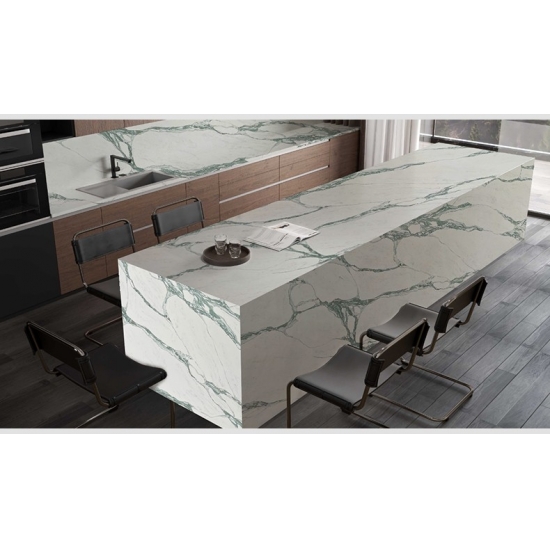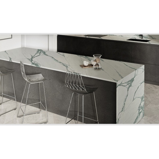 Кварц Calacatta Grigio. Серия кварцевых столешниц Calacatta в настоящее время является самым популярным видом кварцевого камня. Этот кварц предлагает естественный вид мрамора Calacatta, но без недостатков, присущих мраморным столешницам. Кварц Calacatta — очень прочный материал для столешниц, устойчивый к пятнам и царапинам, что делает его очень практичным выбором для кухонных и ванных столешниц, лестниц, подоконников, мебели на заказ, внутренней и внешней отделки стен и полов, гидроабразивной резки и других дизайнерских проектов.