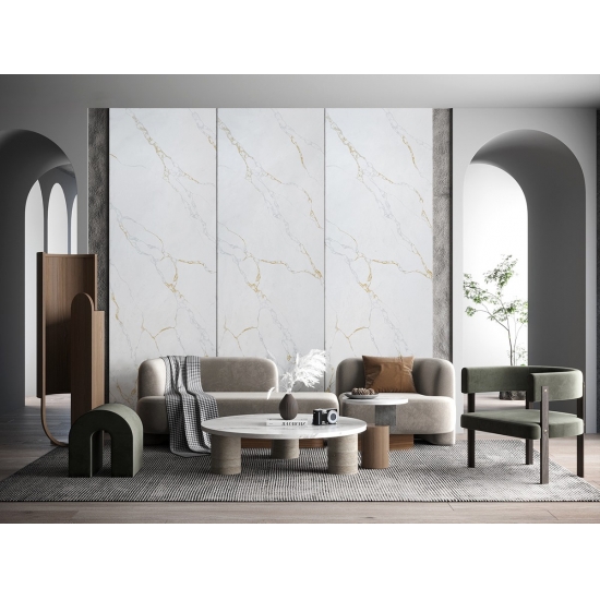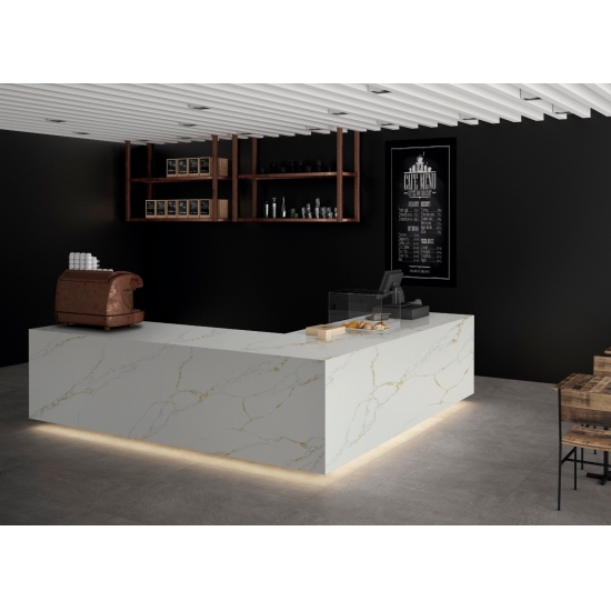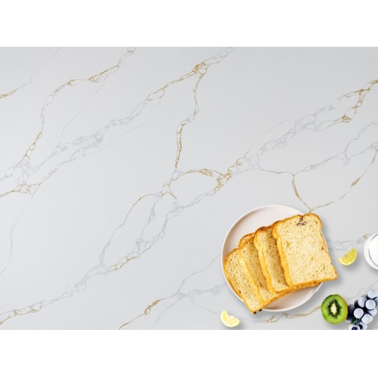 Кварц серии Calacatta в настоящее время является самым популярным кварцевым камнем. Изысканный и уникальный, кварц Calacatta поражает воображение своими чистыми белыми оттенками и эффектными прожилками, имитирующими мрамор. Благодаря красивому, яркому рисунку широких прожилок и роскошной текстуре, этот кварц предлагает естественный вид мрамора Calacatta, но без недостатков, присущих мраморным столешницам. Кварц Calacatta — очень прочный материал для столешниц, устойчивый к пятнам и царапинам, что делает его очень практичным выбором для кухонных и ванных столешниц, лестниц, подоконников, мебели на заказ, внутренней и внешней отделки стен и полов, гидроабразивной резки и других дизайнерских проектов.