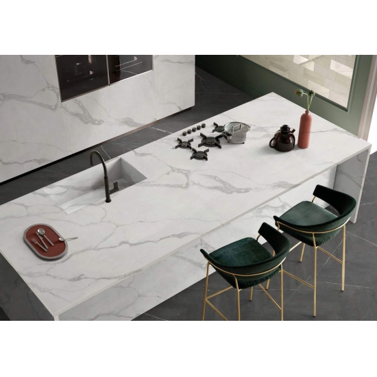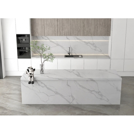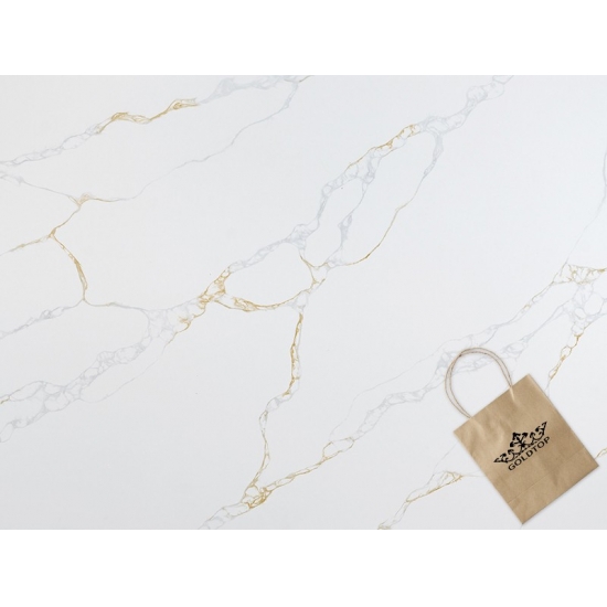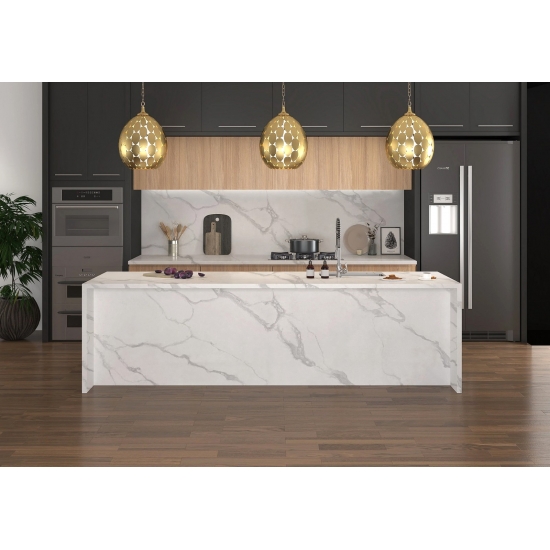 Кварц серии Calacatta в настоящее время является самым популярным кварцевым камнем. Изысканный и уникальный, кварц Calacatta поражает воображение своими чистыми белыми оттенками и эффектными прожилками, имитирующими мрамор. Благодаря красивому, яркому рисунку широких прожилок и роскошной текстуре, этот кварц предлагает естественный вид мрамора Calacatta, но без недостатков, присущих мраморным столешницам. Кварц Calacatta — очень прочный материал для столешниц, устойчивый к пятнам и царапинам, что делает его очень практичным выбором для кухонных и ванных столешниц, лестниц, подоконников, мебели на заказ, внутренней и внешней отделки стен и полов, гидроабразивной резки и других дизайнерских проектов.