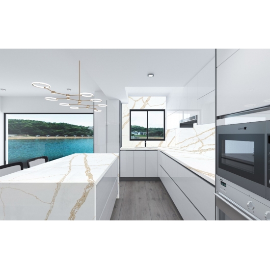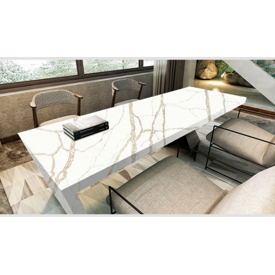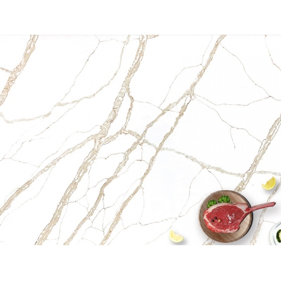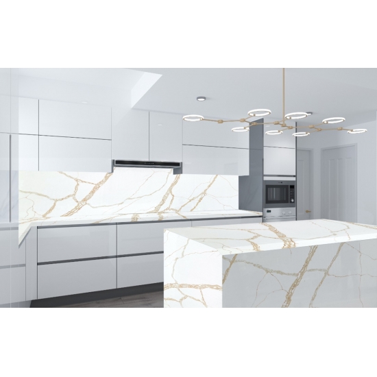 Кварц Калакатта состоит из натуральных компонентов, но при этом прочный, долговечный и обладает низкой пористостью, что делает изделия из кварцевого камня практически износостойкими. Долговечность, комфорт и однородная текстура — главные причины растущей популярности кварцевого камня. Кварцевый камень на 90% состоит из натурального камня, остальное — клей, красители и добавки, улучшающие технические свойства камня. Водопроницаемость и устойчивость к пятнам дополняют красоту кварцевого камня.