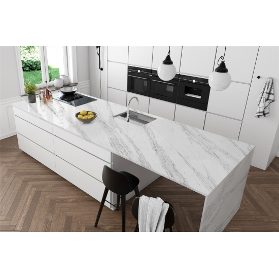 Изысканный и уникальный кварц Calacatta поражает воображение своей чистой белизной и эффектной текстурой, имитирующей мрамор. Благодаря красивому, яркому рисунку широких прожилок и роскошной текстуре, этот кварц предлагает естественный вид мрамора Calacatta, но без недостатков, присущих мраморным столешницам. Кварц Calacatta — очень прочный материал для столешниц, устойчивый к пятнам и царапинам, что делает его очень практичным выбором для кухонных и ванных столешниц, лестниц, подоконников, мебели на заказ, внутренней и внешней отделки стен и полов, гидроабразивной резки и других дизайнерских проектов.