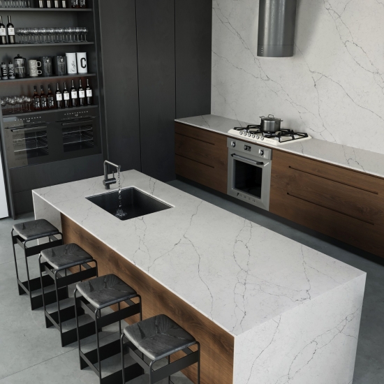 Кварц серии Calacatta в настоящее время является самым популярным кварцевым камнем. Изысканный и уникальный, кварц Calacatta поражает воображение своими чистыми белыми оттенками и эффектными прожилками, имитирующими мрамор. Благодаря красивому, яркому рисунку широких прожилок и роскошной текстуре, этот кварц предлагает естественный вид мрамора Calacatta, но без недостатков, присущих мраморным столешницам. Кварц Calacatta — очень прочный материал для столешниц, устойчивый к пятнам и царапинам, что делает его очень практичным выбором для кухонных и ванных столешниц, лестниц, подоконников, мебели на заказ, внутренней и внешней отделки стен и полов, гидроабразивной резки и других дизайнерских проектов.