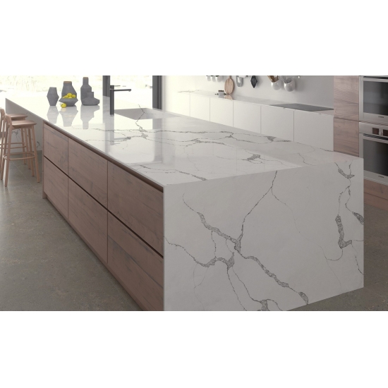Кварц серии Calacatta в настоящее время является самым популярным кварцевым камнем. Изысканный и уникальный, кварц Calacatta поражает воображение своими чистыми белыми оттенками и эффектными прожилками, имитирующими мрамор. Благодаря красивому, яркому рисунку широких прожилок и роскошной текстуре, этот кварц предлагает естественный вид мрамора Calacatta, но без недостатков, присущих мраморным столешницам. Кварц Calacatta — очень прочный материал для столешниц, устойчивый к пятнам и царапинам, что делает его очень практичным выбором для кухонных и ванных столешниц, лестниц, подоконников, мебели на заказ, внутренней и внешней отделки стен и полов, гидроабразивной резки и других дизайнерских проектов.