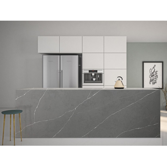 Кварцевая плита 5128 Fior Bosco представляет собой изысканное серое полотно, элегантно очерченное тонкими органическими прожилками, которые вызывают в памяти безмятежную красоту лесного пейзажа. Каждая плита демонстрирует уникальную композицию тональной глубины и плавных переходов, привнося современную и атмосферную безмятежность в любой интерьер. Ее сияющая поверхность усиливает отражение света, создавая динамичный визуальный поток, идеально подходящий для кухонных столешниц, туалетных столиков в ванных комнатах и акцентных стен.