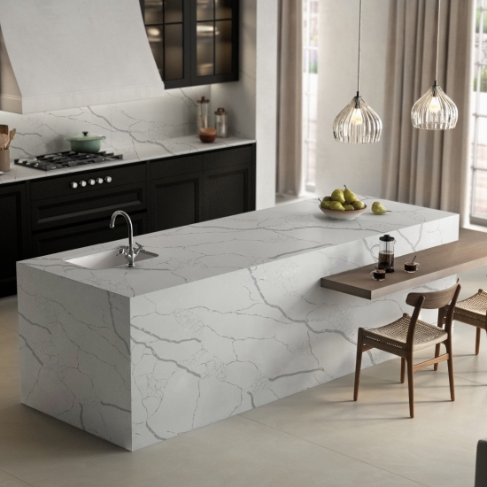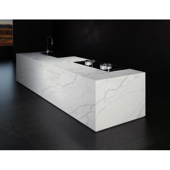 Кварц серии Calacatta в настоящее время является самым популярным кварцевым камнем. Изысканный и уникальный, кварц Calacatta поражает воображение своими чистыми белыми оттенками и эффектными прожилками, имитирующими мрамор. Благодаря красивому, яркому рисунку широких прожилок и роскошной текстуре, этот кварц предлагает естественный вид мрамора Calacatta, но без недостатков, присущих мраморным столешницам. Кварц Calacatta — очень прочный материал для столешниц, устойчивый к пятнам и царапинам, что делает его очень практичным выбором для кухонных и ванных столешниц, лестниц, подоконников, мебели на заказ, внутренней и внешней отделки стен и полов, гидроабразивной резки и других дизайнерских проектов.