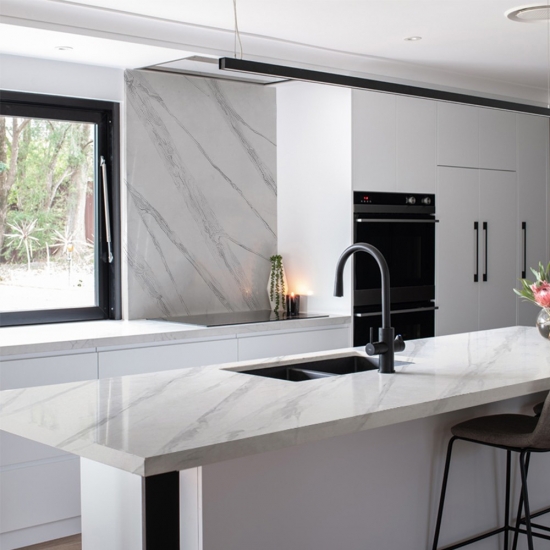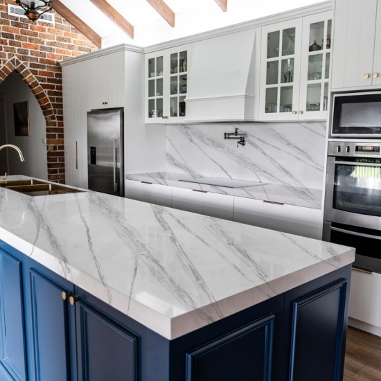 Изысканный и уникальный кварц Calacatta поражает воображение своей чистой белизной и эффектной текстурой, имитирующей мрамор. Благодаря красивому, яркому рисунку широких прожилок и роскошной текстуре, этот кварц предлагает естественный вид мрамора Calacatta, но без недостатков, присущих мраморным столешницам. Кварц Calacatta — очень прочный материал для столешниц, устойчивый к пятнам и царапинам, что делает его очень практичным выбором для кухонных и ванных столешниц, лестниц, подоконников, мебели на заказ, внутренней и внешней отделки стен и полов, гидроабразивной резки и других дизайнерских проектов.