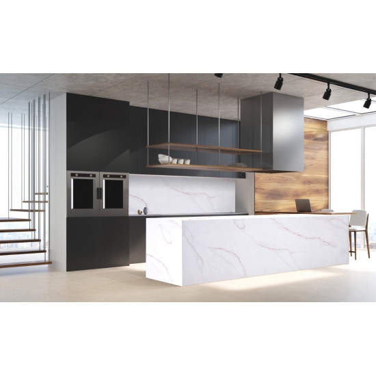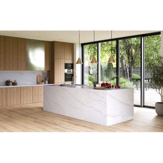 Кварц Калакатта состоит из натуральных компонентов, но при этом прочный, долговечный и обладает низкой пористостью, что делает изделия из кварцевого камня практически износостойкими. Долговечность, комфорт и однородная текстура — главные причины растущей популярности кварцевого камня. Кварцевый камень на 90% состоит из натурального камня, остальное — клей, красители и добавки, улучшающие технические свойства камня. Водопроницаемость и устойчивость к пятнам дополняют красоту кварцевого камня.