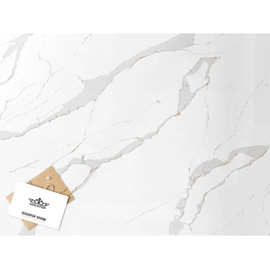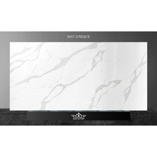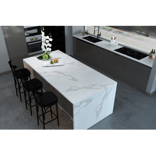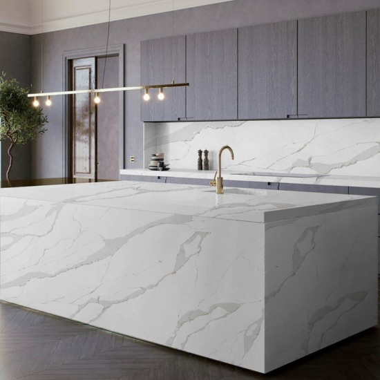 Кварц серии Calacatta в настоящее время является самым популярным кварцевым камнем. Изысканный и уникальный, кварц Calacatta поражает воображение своими чистыми белыми оттенками и эффектными прожилками, имитирующими мрамор. Благодаря красивому, яркому рисунку широких прожилок и роскошной текстуре, этот кварц предлагает естественный вид мрамора Calacatta, но без недостатков, присущих мраморным столешницам. Кварц Calacatta — очень прочный материал для столешниц, устойчивый к пятнам и царапинам, что делает его очень практичным выбором для кухонных и ванных столешниц, лестниц, подоконников, мебели на заказ, внутренней и внешней отделки стен и полов, гидроабразивной резки и других дизайнерских проектов.