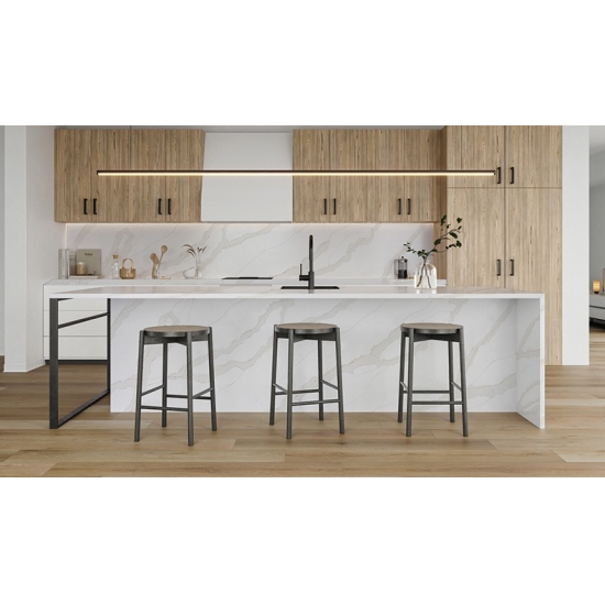Кварцевая плита 5059 Calacatta Paris отличается ярко-белым основанием, подчеркнутым выразительными серыми прожилками. Этот яркий контраст создает динамичный и роскошный визуальный эффект. Эта плита воплощает современную элегантность и идеально подходит для создания изысканного акцента в любом интерьере.