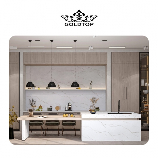 5061 Wave Extra Quartz — это высококачественный искусственный камень, известный своим элегантным современным видом и долговечностью. Благодаря изящным волнообразным узорам, имитирующим естественное течение воды, этот кварц идеально подходит для столешниц, фартуков и других поверхностей. Его чистый, современный дизайн и неприхотливость в уходе делают его идеальным выбором как для жилых, так и для коммерческих помещений, добавляя нотку изысканности и вневременной красоты.