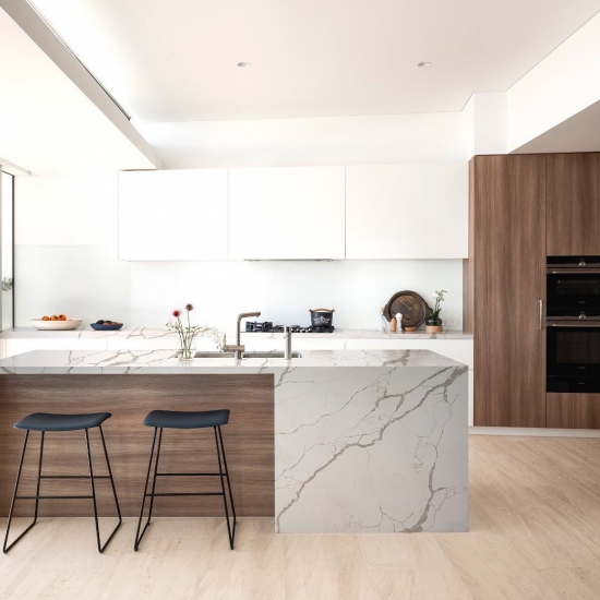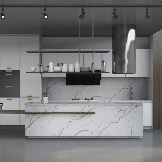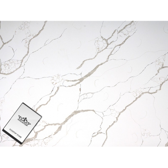 Кварц серии Calacatta в настоящее время является самым популярным кварцевым камнем. Изысканный и уникальный, кварц Calacatta поражает воображение своими чистыми белыми оттенками и эффектными прожилками, имитирующими мрамор. Благодаря красивому, яркому рисунку широких прожилок и роскошной текстуре, этот кварц предлагает естественный вид мрамора Calacatta, но без недостатков, присущих мраморным столешницам. Кварц Calacatta — очень прочный материал для столешниц, устойчивый к пятнам и царапинам, что делает его очень практичным выбором для кухонных и ванных столешниц, лестниц, подоконников, мебели на заказ, внутренней и внешней отделки стен и полов, гидроабразивной резки и других дизайнерских проектов.