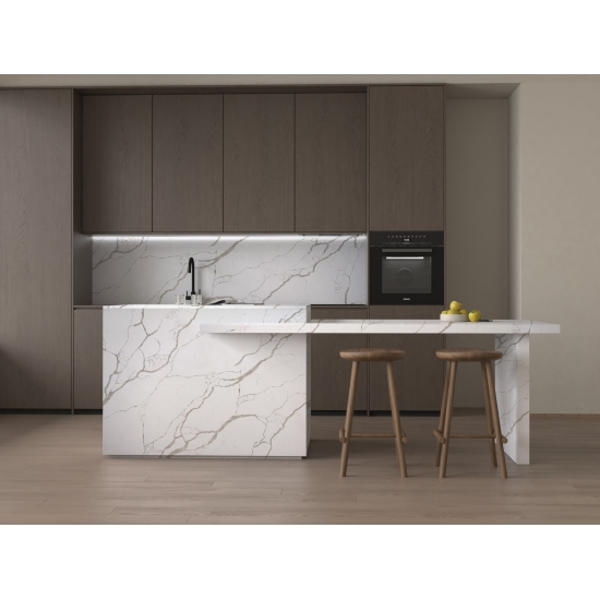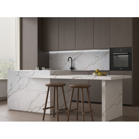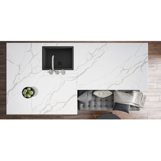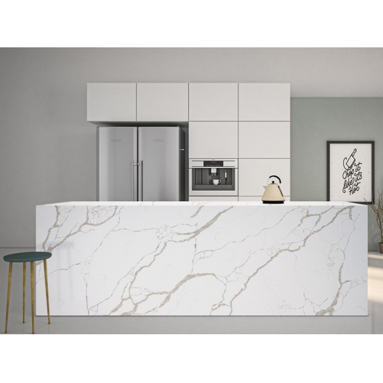 Кварц Калакатта состоит из натуральных компонентов, но при этом прочный, долговечный и обладает низкой пористостью, что делает изделия из кварцевого камня практически износостойкими. Долговечность, комфорт и однородная текстура — главные причины растущей популярности кварцевого камня. Кварцевый камень на 90% состоит из натурального камня, остальное — клей, красители и добавки, улучшающие технические свойства камня. Водопроницаемость и устойчивость к пятнам дополняют красоту кварцевого камня.