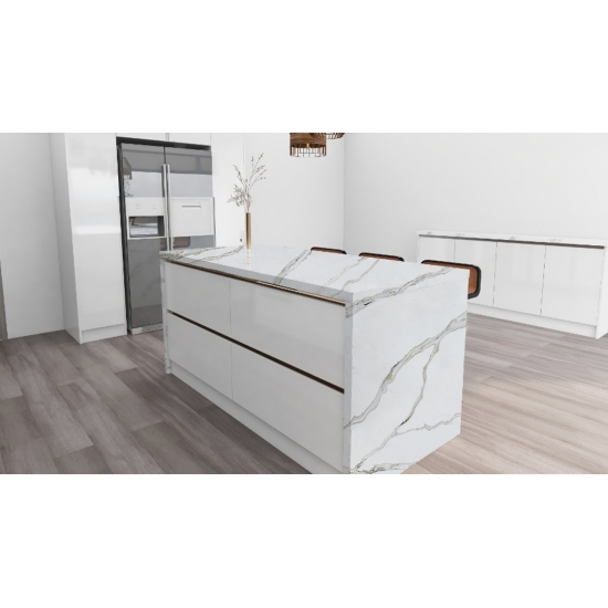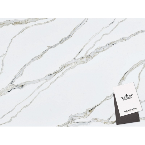 Кварц серии Calacatta в настоящее время является самым популярным кварцевым камнем. Изысканный и уникальный, кварц Calacatta поражает воображение своими чистыми белыми оттенками и эффектными прожилками, имитирующими мрамор. Благодаря красивому, яркому рисунку широких прожилок и роскошной текстуре, этот кварц предлагает естественный вид мрамора Calacatta, но без недостатков, присущих мраморным столешницам. Кварц Calacatta — очень прочный материал для столешниц, устойчивый к пятнам и царапинам, что делает его очень практичным выбором для кухонных и ванных столешниц, лестниц, подоконников, мебели на заказ, внутренней и внешней отделки стен и полов, гидроабразивной резки и других дизайнерских проектов.