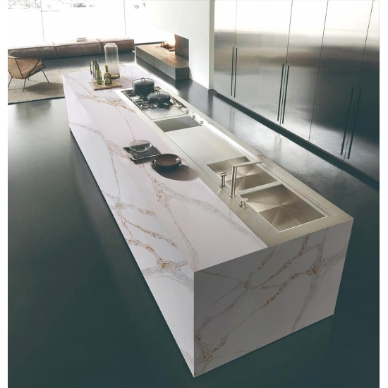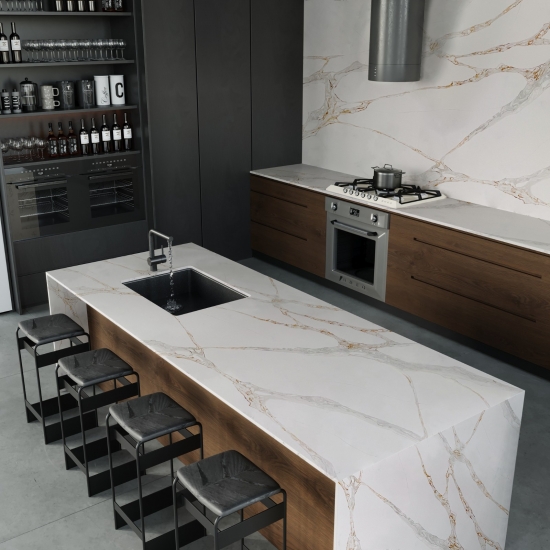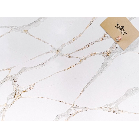Кварц серии Calacatta в настоящее время является самым популярным кварцевым камнем. Изысканный и уникальный, кварц Calacatta поражает воображение своими чистыми белыми оттенками и эффектными прожилками, имитирующими мрамор. Благодаря красивому, яркому рисунку широких прожилок и роскошной текстуре, этот кварц предлагает естественный вид мрамора Calacatta, но без недостатков, присущих мраморным столешницам. Кварц Calacatta — очень прочный материал для столешниц, устойчивый к пятнам и царапинам, что делает его очень практичным выбором для кухонных и ванных столешниц, лестниц, подоконников, мебели на заказ, внутренней и внешней отделки стен и полов, гидроабразивной резки и других дизайнерских проектов.