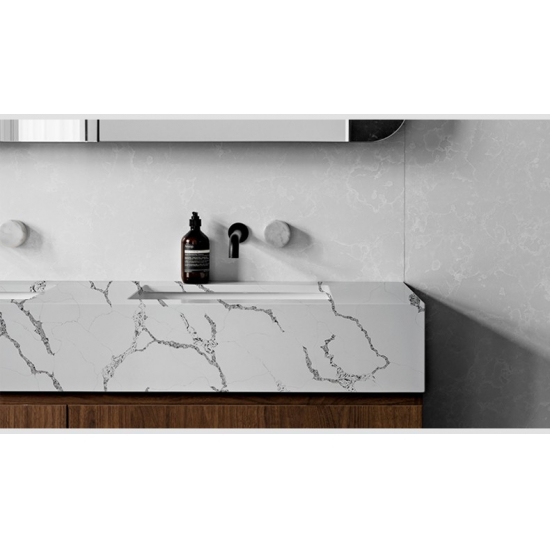 Кварцевая плита Calacatta Vagli 5077 имеет ярко-белую основу, смело испещренную глубокими, эффектными серыми прожилками. Яркий контраст создает мощное ощущение глубины и динамичности. Эта плита воплощает современную роскошь и идеально подходит для создания потрясающего акцента в любом современном интерьере.