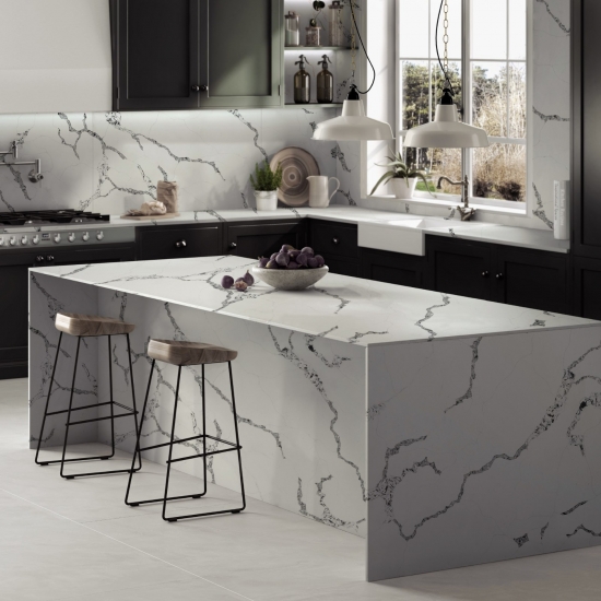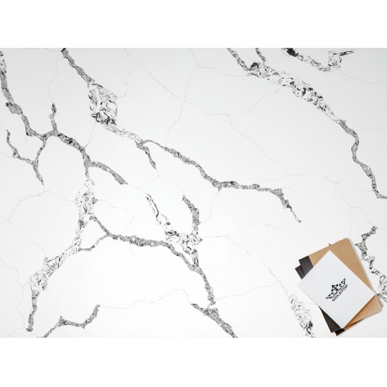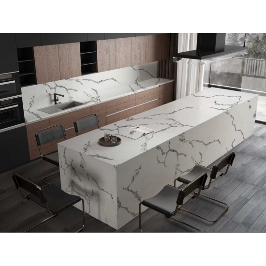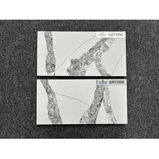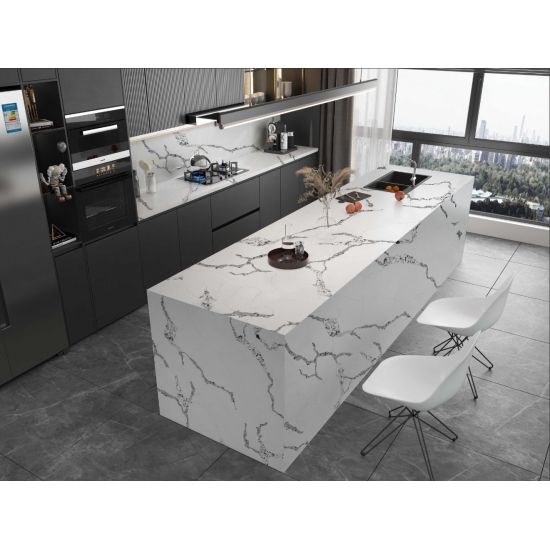Кварц серии Calacatta в настоящее время является самым популярным кварцевым камнем. Изысканный и уникальный, кварц Calacatta поражает воображение своими чистыми белыми оттенками и эффектными прожилками, имитирующими мрамор. Благодаря красивому, яркому рисунку широких прожилок и роскошной текстуре, этот кварц предлагает естественный вид мрамора Calacatta, но без недостатков, присущих мраморным столешницам. Кварц Calacatta — очень прочный материал для столешниц, устойчивый к пятнам и царапинам, что делает его очень практичным выбором для кухонных и ванных столешниц, лестниц, подоконников, мебели на заказ, внутренней и внешней отделки стен и полов, гидроабразивной резки и других дизайнерских проектов.
