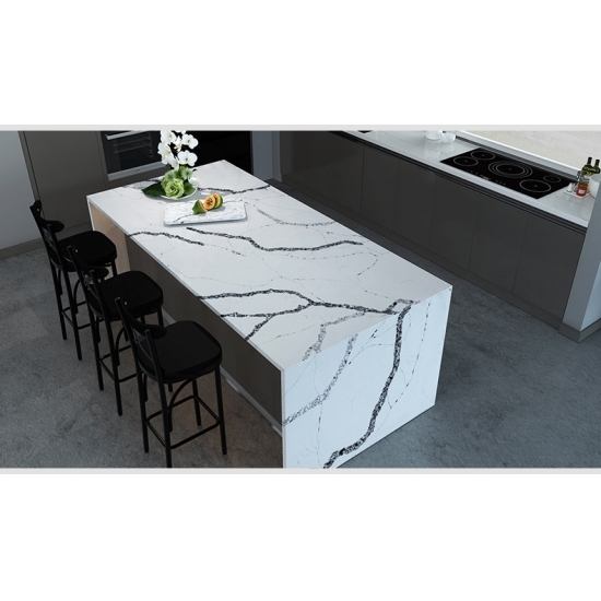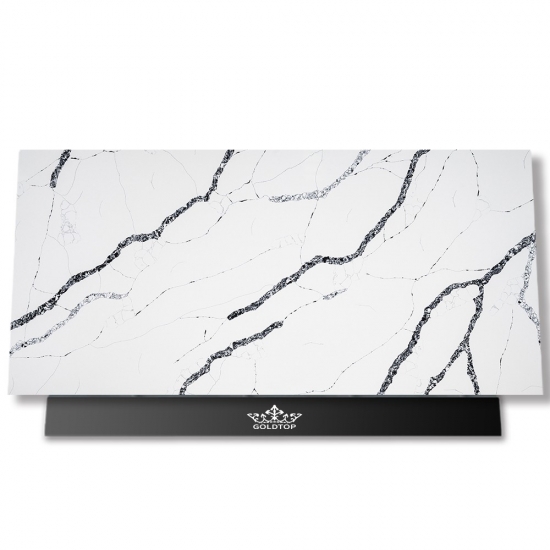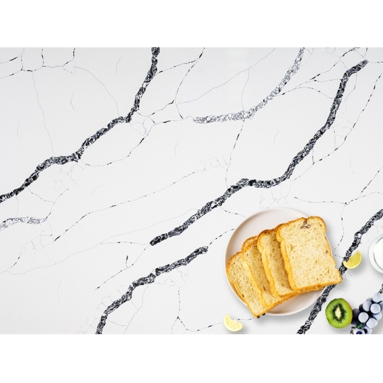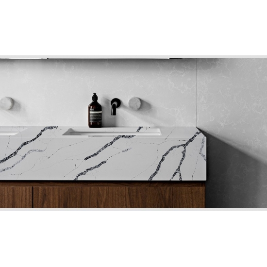 Кварцевая плита Calacatta Vera 5083 отличается ярко-белым основанием с выразительными, смелыми серыми прожилками. Этот эффектный контраст создает мощное ощущение глубины и движения. Эта плита воплощает роскошную элегантность и идеально подходит для создания изысканного акцента в любом современном интерьере.