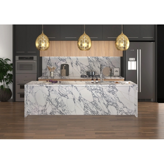 Изысканный и уникальный кварц Calacatta поражает воображение своей чистой белизной и эффектной текстурой, имитирующей мрамор. Благодаря красивому, яркому рисунку широких прожилок и роскошной текстуре, этот кварц предлагает естественный вид мрамора Calacatta, но без недостатков, присущих мраморным столешницам. Кварц Calacatta — очень прочный материал для столешниц, устойчивый к пятнам и царапинам, что делает его очень практичным выбором для кухонных и ванных столешниц, лестниц, подоконников, мебели на заказ, внутренней и внешней отделки стен и полов, гидроабразивной резки и других дизайнерских проектов.