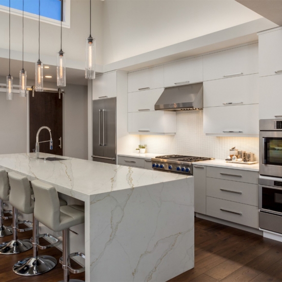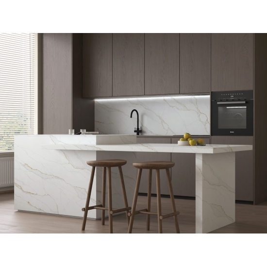 Изысканный и уникальный кварц Calacatta поражает воображение своей чистой белизной и эффектной текстурой, имитирующей мрамор. Благодаря красивому, яркому рисунку широких прожилок и роскошной текстуре, этот кварц предлагает естественный вид мрамора Calacatta, но без недостатков, присущих мраморным столешницам. Кварц Calacatta — очень прочный материал для столешниц, устойчивый к пятнам и царапинам, что делает его очень практичным выбором для кухонных и ванных столешниц, лестниц, подоконников, мебели на заказ, внутренней и внешней отделки стен и полов, гидроабразивной резки и других дизайнерских проектов.
