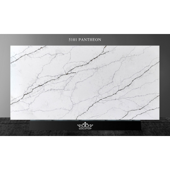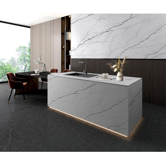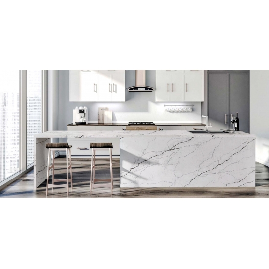 Кварц серии Calacatta в настоящее время является самым популярным кварцевым камнем. Изысканный и уникальный, кварц Calacatta поражает воображение своими чистыми белыми оттенками и эффектными прожилками, имитирующими мрамор. Благодаря красивому, яркому рисунку широких прожилок и роскошной текстуре, этот кварц предлагает естественный вид мрамора Calacatta, но без недостатков, присущих мраморным столешницам. Кварц Calacatta — очень прочный материал для столешниц, устойчивый к пятнам и царапинам, что делает его очень практичным выбором для кухонных и ванных столешниц, лестниц, подоконников, мебели на заказ, внутренней и внешней отделки стен и полов, гидроабразивной резки и других дизайнерских проектов.