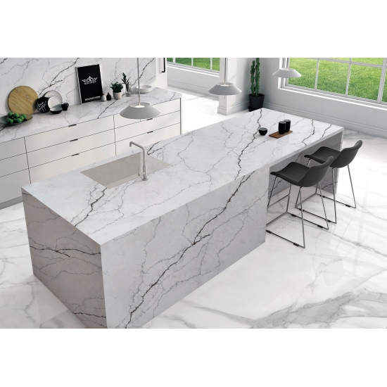 Изысканный и уникальный кварц Calacatta поражает воображение своей чистой белизной и эффектной текстурой, имитирующей мрамор. Благодаря красивому, яркому рисунку широких прожилок и роскошной текстуре, этот кварц предлагает естественный вид мрамора Calacatta, но без недостатков, присущих мраморным столешницам. Кварц Calacatta — очень прочный материал для столешниц, устойчивый к пятнам и царапинам, что делает его очень практичным выбором для кухонных и ванных столешниц, лестниц, подоконников, мебели на заказ, внутренней и внешней отделки стен и полов, гидроабразивной резки и других дизайнерских проектов.