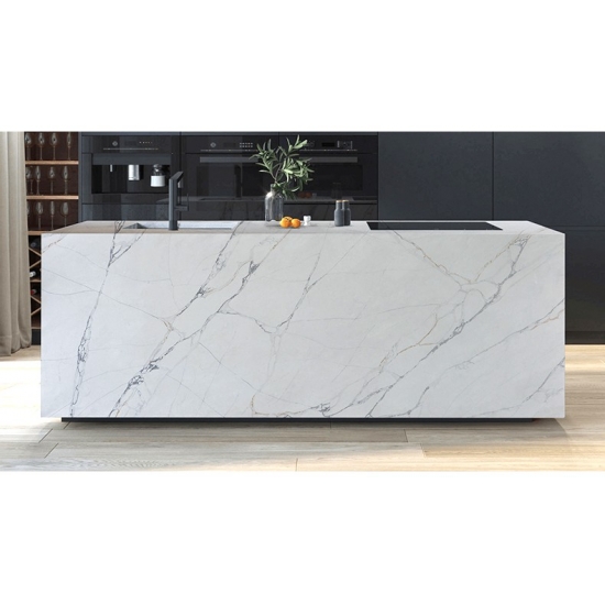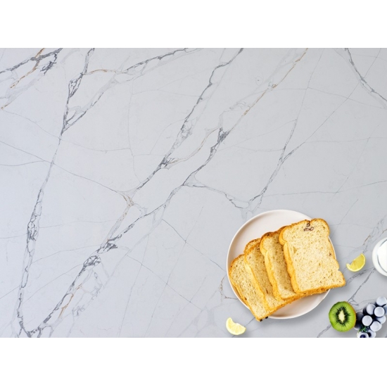 Изысканный и уникальный кварц Calacatta поражает воображение своей чистой белизной и эффектной текстурой, имитирующей мрамор. Благодаря красивому, яркому рисунку широких прожилок и роскошной текстуре, этот кварц предлагает естественный вид мрамора Calacatta, но без недостатков, присущих мраморным столешницам. Кварц Calacatta — очень прочный материал для столешниц, устойчивый к пятнам и царапинам, что делает его очень практичным выбором для кухонных и ванных столешниц, лестниц, подоконников, мебели на заказ, внутренней и внешней отделки стен и полов, гидроабразивной резки и других дизайнерских проектов.