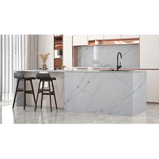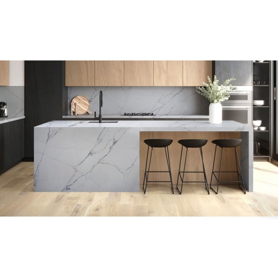 50 Square MetersИзысканный и уникальный кварц Calacatta поражает воображение своей чистой белизной и эффектной текстурой, имитирующей мрамор. Благодаря красивому, яркому рисунку широких прожилок и роскошной текстуре, этот кварц предлагает естественный вид мрамора Calacatta, но без недостатков, присущих мраморным столешницам. Кварц Calacatta — очень прочный материал для столешниц, устойчивый к пятнам и царапинам, что делает его очень практичным выбором для кухонных и ванных столешниц, лестниц, подоконников, мебели на заказ, внутренней и внешней отделки стен и полов, гидроабразивной резки и других дизайнерских проектов.