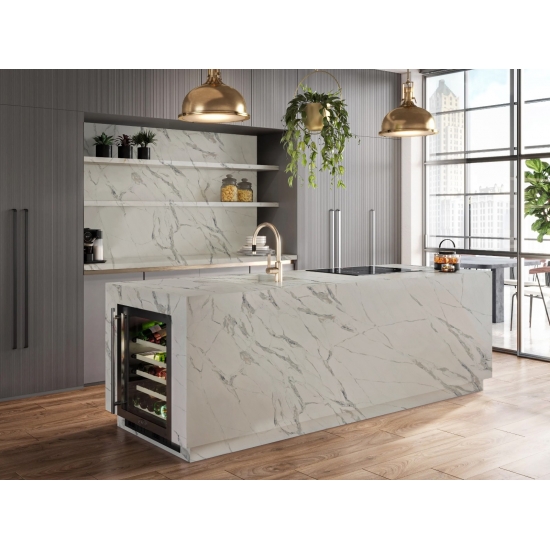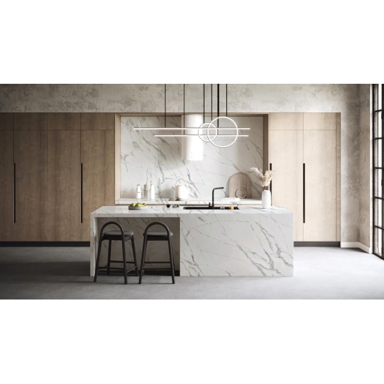 Изысканный и уникальный кварц Calacatta поражает воображение своей чистой белизной и эффектной текстурой, имитирующей мрамор. Благодаря красивому, яркому рисунку широких прожилок и роскошной текстуре, этот кварц предлагает естественный вид мрамора Calacatta, но без недостатков, присущих мраморным столешницам. Кварц Calacatta — очень прочный материал для столешниц, устойчивый к пятнам и царапинам, что делает его очень практичным выбором для кухонных и ванных столешниц, лестниц, подоконников, мебели на заказ, внутренней и внешней отделки стен и полов, гидроабразивной резки и других дизайнерских проектов.