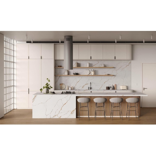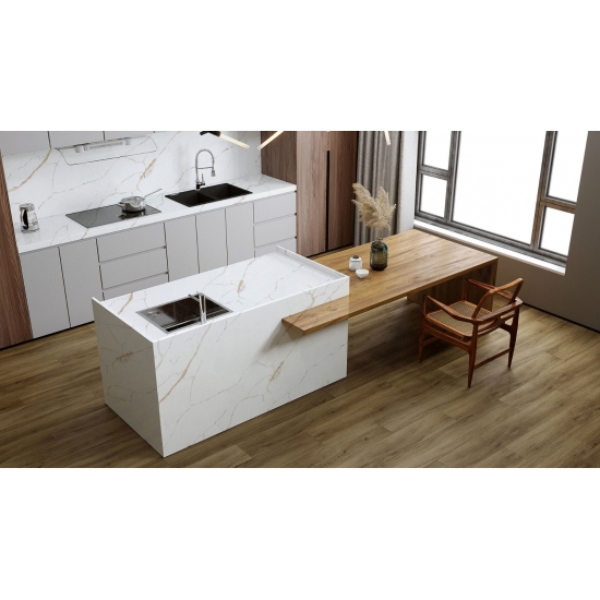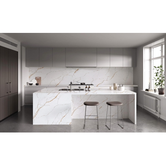 Изысканный и уникальный кварц Calacatta поражает воображение своей чистой белизной и эффектной текстурой, имитирующей мрамор. Благодаря красивому, яркому рисунку широких прожилок и роскошной текстуре, этот кварц предлагает естественный вид мрамора Calacatta, но без недостатков, присущих мраморным столешницам. Кварц Calacatta — очень прочный материал для столешниц, устойчивый к пятнам и царапинам, что делает его очень практичным выбором для кухонных и ванных столешниц, лестниц, подоконников, мебели на заказ, внутренней и внешней отделки стен и полов, гидроабразивной резки и других дизайнерских проектов.