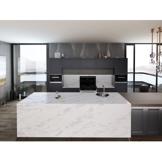 Кварц серии Calacatta в настоящее время является самым популярным кварцевым камнем. Изысканный и уникальный, кварц Calacatta поражает воображение своими чистыми белыми оттенками и эффектными прожилками, имитирующими мрамор. Благодаря красивому, яркому рисунку широких прожилок и роскошной текстуре, этот кварц предлагает естественный вид мрамора Calacatta, но без недостатков, присущих мраморным столешницам. Кварц Calacatta — очень прочный материал для столешниц, устойчивый к пятнам и царапинам, что делает его очень практичным выбором для кухонных и ванных столешниц, лестниц, подоконников, мебели на заказ, внутренней и внешней отделки стен и полов, гидроабразивной резки и других дизайнерских проектов.