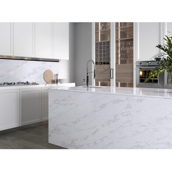 Изысканный и уникальный кварц Calacatta поражает воображение своей чистой белизной и эффектной текстурой, имитирующей мрамор. Благодаря красивому, яркому рисунку широких прожилок и роскошной текстуре, этот кварц предлагает естественный вид мрамора Calacatta, но без недостатков, присущих мраморным столешницам. Кварц Calacatta — очень прочный материал для столешниц, устойчивый к пятнам и царапинам, что делает его очень практичным выбором для кухонных и ванных столешниц, лестниц, подоконников, мебели на заказ, внутренней и внешней отделки стен и полов, гидроабразивной резки и других дизайнерских проектов.