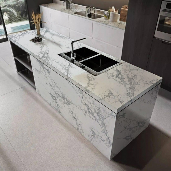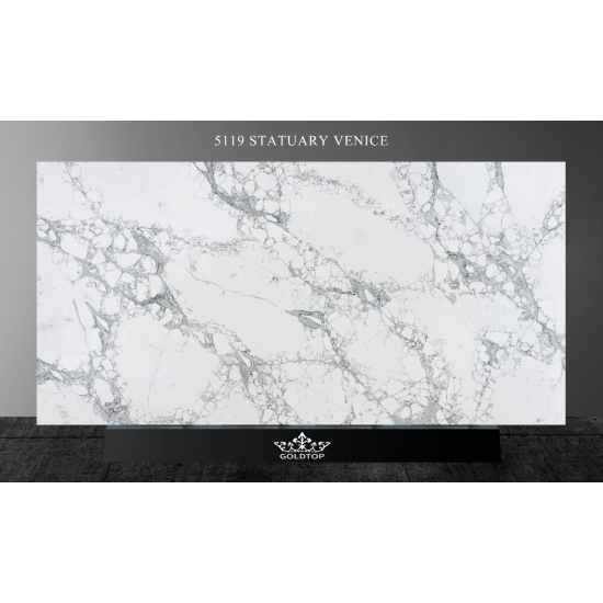 Кварц серии Calacatta в настоящее время является самым популярным кварцевым камнем. Изысканный и уникальный, кварц Calacatta поражает воображение своими чистыми белыми оттенками и эффектными прожилками, имитирующими мрамор. Благодаря красивому, яркому рисунку широких прожилок и роскошной текстуре, этот кварц предлагает естественный вид мрамора Calacatta, но без недостатков, присущих мраморным столешницам. Кварц Calacatta — очень прочный материал для столешниц, устойчивый к пятнам и царапинам, что делает его очень практичным выбором для кухонных и ванных столешниц, лестниц, подоконников, мебели на заказ, внутренней и внешней отделки стен и полов, гидроабразивной резки и других дизайнерских проектов.