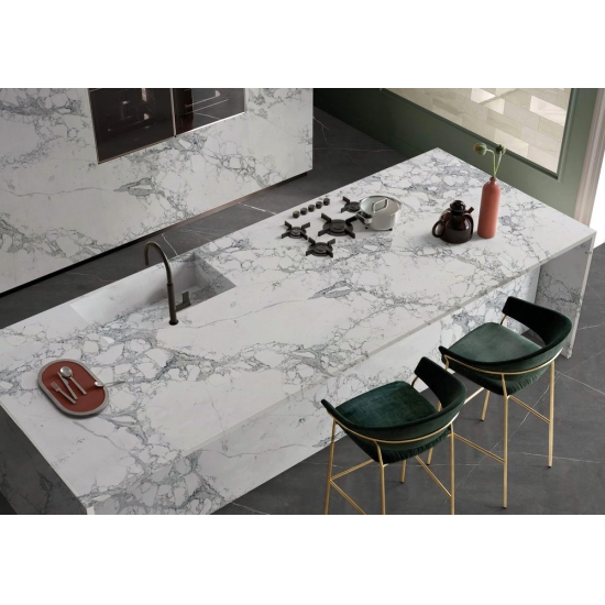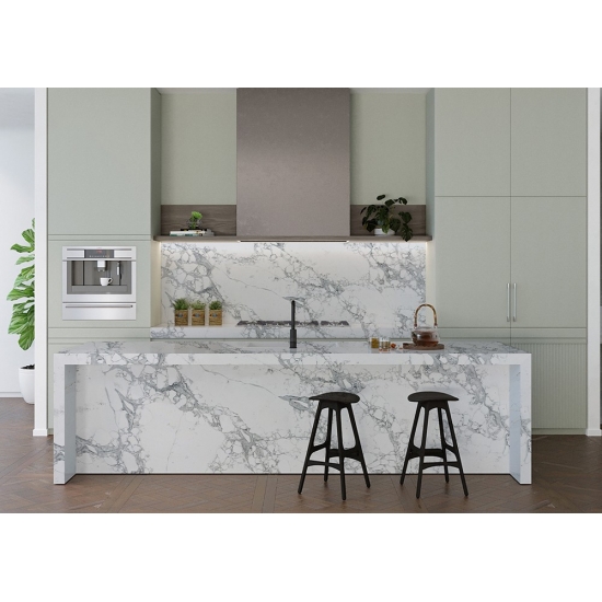 Изысканный и уникальный кварц Calacatta поражает воображение своей чистой белизной и эффектной текстурой, имитирующей мрамор. Благодаря красивому, яркому рисунку широких прожилок и роскошной текстуре, этот кварц предлагает естественный вид мрамора Calacatta, но без недостатков, присущих мраморным столешницам. Кварц Calacatta — очень прочный материал для столешниц, устойчивый к пятнам и царапинам, что делает его очень практичным выбором для кухонных и ванных столешниц, лестниц, подоконников, мебели на заказ, внутренней и внешней отделки стен и полов, гидроабразивной резки и других дизайнерских проектов.