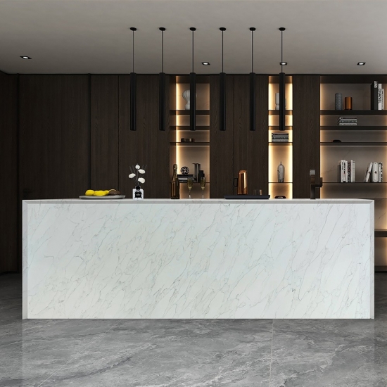 Кварц серии Calacatta в настоящее время является самым популярным кварцевым камнем. Изысканный и уникальный, кварц Calacatta поражает воображение своими чистыми белыми оттенками и эффектными прожилками, имитирующими мрамор. Благодаря красивому, яркому рисунку широких прожилок и роскошной текстуре, этот кварц предлагает естественный вид мрамора Calacatta, но без недостатков, присущих мраморным столешницам. Кварц Calacatta — очень прочный материал для столешниц, устойчивый к пятнам и царапинам, что делает его очень практичным выбором для кухонных и ванных столешниц, лестниц, подоконников, мебели на заказ, внутренней и внешней отделки стен и полов, гидроабразивной резки и других дизайнерских проектов.
