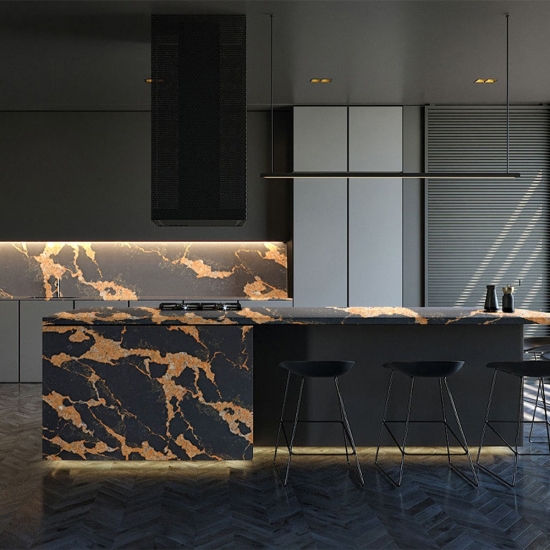 Изысканный и уникальный кварц Calacatta поражает воображение своей чистой белизной и эффектной текстурой, имитирующей мрамор. Благодаря красивому, яркому рисунку широких прожилок и роскошной текстуре, этот кварц предлагает естественный вид мрамора Calacatta, но без недостатков, присущих мраморным столешницам. Кварц Calacatta — очень прочный материал для столешниц, устойчивый к пятнам и царапинам, что делает его очень практичным выбором для кухонных и ванных столешниц, лестниц, подоконников, мебели на заказ, внутренней и внешней отделки стен и полов, гидроабразивной резки и других дизайнерских проектов.