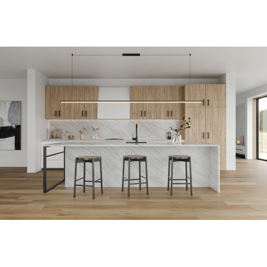 Изысканный и уникальный кварц Calacatta поражает воображение своей чистой белизной и эффектной текстурой, имитирующей мрамор. Благодаря красивому, яркому рисунку широких прожилок и роскошной текстуре, этот кварц предлагает естественный вид мрамора Calacatta, но без недостатков, присущих мраморным столешницам. Кварц Calacatta — очень прочный материал для столешниц, устойчивый к пятнам и царапинам, что делает его очень практичным выбором для кухонных и ванных столешниц, лестниц, подоконников, мебели на заказ, внутренней и внешней отделки стен и полов, гидроабразивной резки и других дизайнерских проектов.