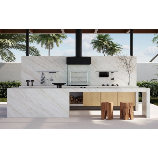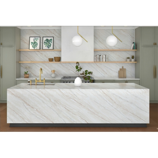 50 Square MetersИзысканный и уникальный кварц Calacatta поражает воображение своей чистой белизной и эффектной текстурой, имитирующей мрамор. Благодаря красивому, яркому рисунку широких прожилок и роскошной текстуре, этот кварц предлагает естественный вид мрамора Calacatta, но без недостатков, присущих мраморным столешницам. Кварц Calacatta — очень прочный материал для столешниц, устойчивый к пятнам и царапинам, что делает его очень практичным выбором для кухонных и ванных столешниц, лестниц, подоконников, мебели на заказ, внутренней и внешней отделки стен и полов, гидроабразивной резки и других дизайнерских проектов.