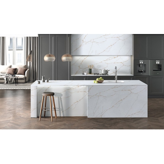 Кварцевая плитка Calacatta Arno представляет собой шедевр инженерной элегантности, воплощающий сущность ценного натурального мрамора. Она демонстрирует теплый, привлекательный белый фон, изящно испещренный тонкими серыми прожилками, каждая из которых деликатно подчеркнута едва заметными золотистыми бликами. Эта роскошная композиция передает вневременную драматичность и утонченную красоту мрамора, идеально подходящую для создания центрального элемента в любом интерьере. Доступная для столешниц, фартуков и акцентных стен, она привносит гармоничное сочетание классического вдохновения и современной роскоши в кухни, ванные комнаты и другие помещения.