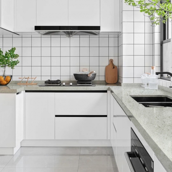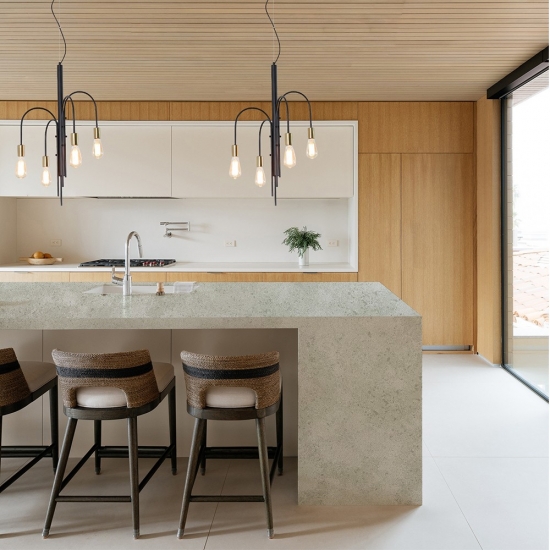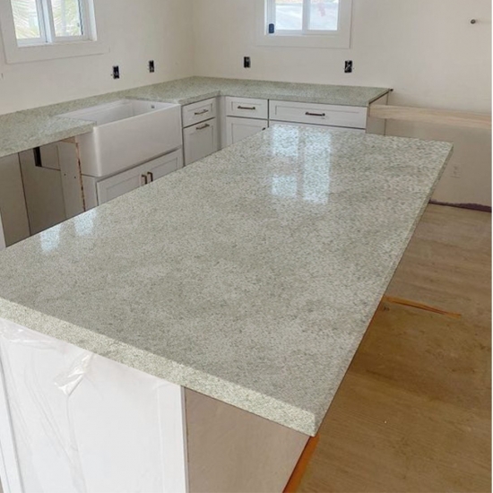 Кварц «Белый цемент» с текстурой «снежинка» — это специально обработанный искусственный кварцевый материал. Подобно матовой поверхности, бетонная отделка немного изменяет цвет кварца по сравнению с классической полированной поверхностью. Такая отделка также называется «шлифованной» применительно к граниту.