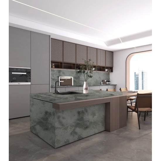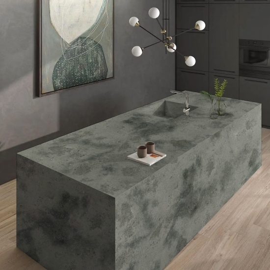Бетонный кварц — это специально обработанный искусственный кварцевый материал. Подобно матовой поверхности, бетонная отделка немного изменяет цвет кварца по сравнению с классической полированной поверхностью. Применительно к граниту такую отделку также называют «шлифованной».