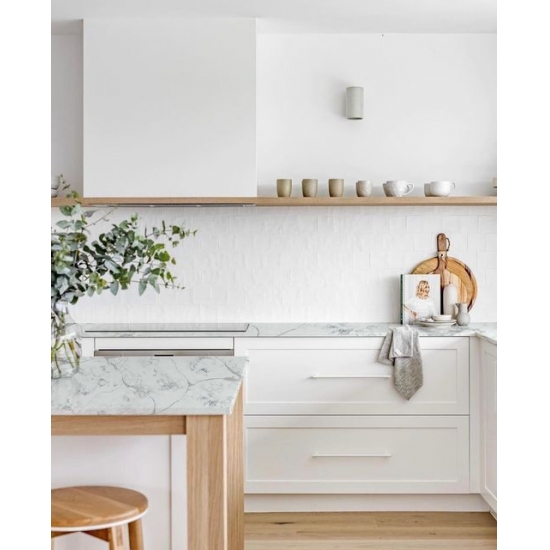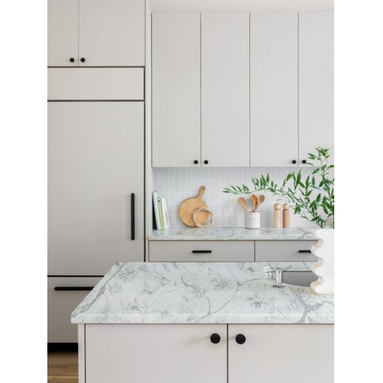 Кварц «Белый цемент» с текстурой «снежинка» — это специально обработанный искусственный кварцевый материал. Подобно матовой поверхности, бетонная отделка немного изменяет цвет кварца по сравнению с классической полированной поверхностью. Такая отделка также называется «шлифованной» применительно к граниту.
