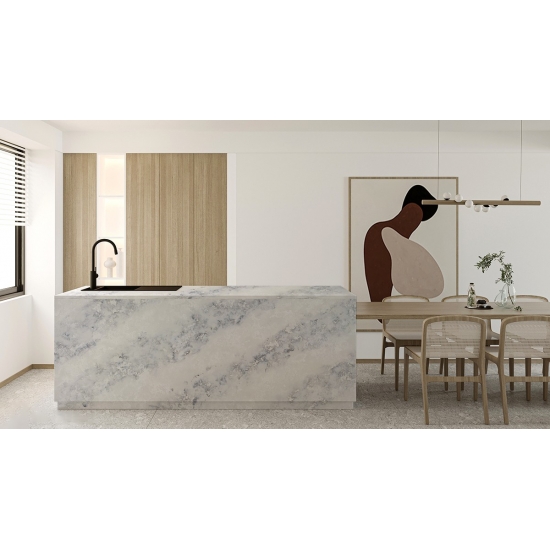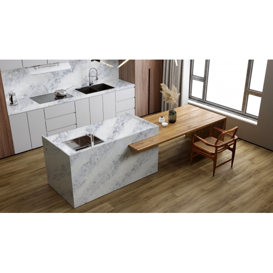 Кварц «Белый цемент» с текстурой «снежинка» — это специально обработанный искусственный кварцевый материал. Подобно матовой поверхности, бетонная отделка немного изменяет цвет кварца по сравнению с классической полированной поверхностью. Такая отделка также называется «шлифованной» применительно к граниту.
