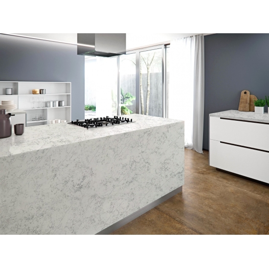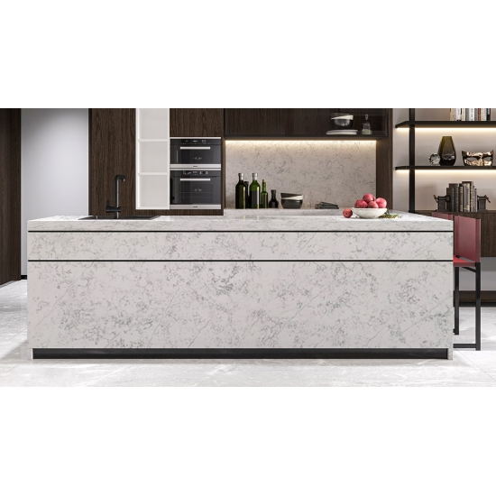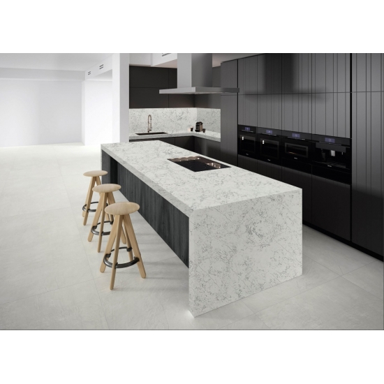 Кварц «Белый цемент» с текстурой «снежинка» — это специально обработанный искусственный кварцевый материал. Подобно матовой поверхности, бетонная отделка немного изменяет цвет кварца по сравнению с классической полированной поверхностью. Такая отделка также называется «шлифованной» применительно к граниту.