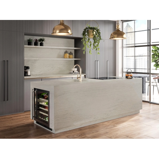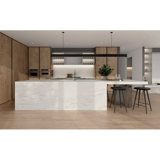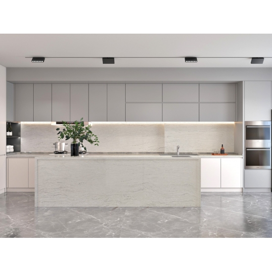 Кварц «Белый цемент» с текстурой «снежинка» — это специально обработанный искусственный кварцевый материал. Подобно матовой поверхности, бетонная отделка немного изменяет цвет кварца по сравнению с классической полированной поверхностью. Такая отделка также называется «шлифованной» применительно к граниту.